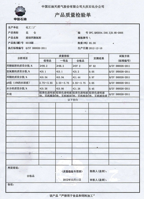 本標準適用于丙酮與氫氰酸反應制得的精制丙酮氰醇。